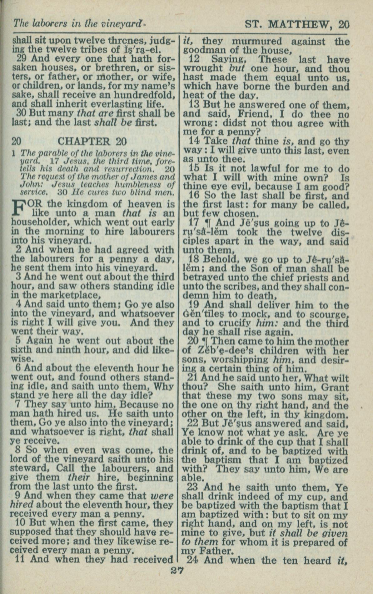 1946年King James Version 马太福音 19 章 29 节到 20 章 24 节