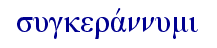 | 04786 συγκεράννυμι 动词 1不定式συνεκέρασα;完被分συγκεκερασμένος。「调和」, 来4:2 ,或为συγκεκραμένος公认经文。「混合,搀,连合」。 喻意:τὸ σῶμα配搭身子, 林前12:24 。οὐκ ὠφέλησεν ὁ λόγος τῆς ἀκοῆς ἐκείνους μὴ συγκεκερασμένους τῇ πίστει τοῖς ἀκούσασιν只是所听见的道与他们无益,因为他们没有信心与所听见的道调合, 来4:2 。其他抄本有复数直接受格συγκεκερασμένος大概等于-他们不是与用心听道的人相连合。* 说明 |